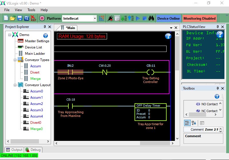 VSLogix is a powerful and easy-to-use ladder-logic programming tool designed for the IntellECAT PLC/Gateway. Built to meet industrial standards, it is perfect for various specialized applications. VSLogix also directly connects to IntellECAT cards and their networks, making it simple to configure and monitor ladder programs in real-time, as well as check the status and I/O of all connected GX20 cards.