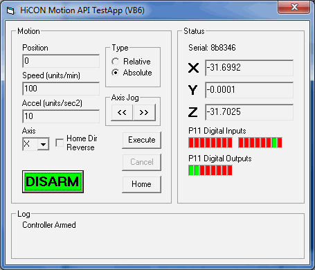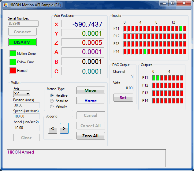 This example shows how to properly interface and operate with the HiCON. It also makes use of most features such as Digital and Analog I/O manipulation, motion, and more. Users will find this sample particularly helpful for a good starting point.